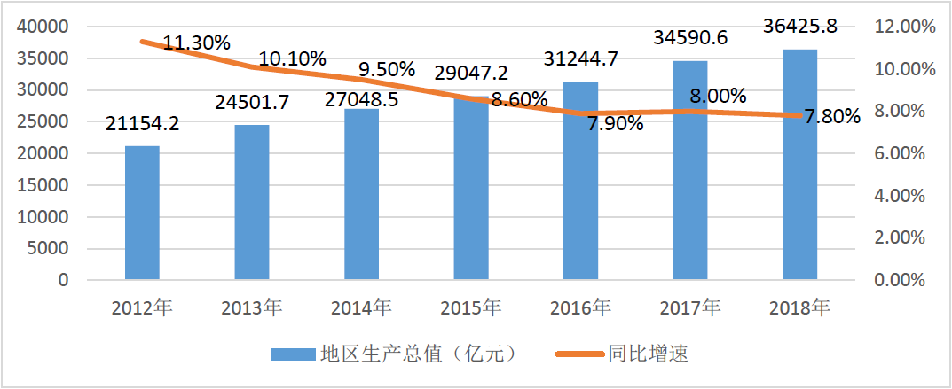 图1 2012年-2018年湖南省地区生产总值及同比增速情况