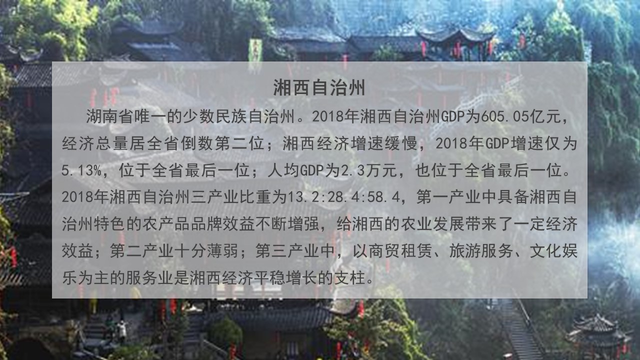 2018年大湘西地区实现地区生产总值6020.30亿元,占全省地区生产总值的16.0%,整体经济实力较弱。大湘西地区少数民族较多,为丘陵向云贵高原的过度地带,主要依靠旅游业拉动经济,农业及工业发展较缓。