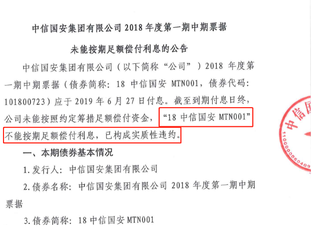 6月27日,中信国安集团有限公司(以下简称“中信国安集团”)在上清所发布公告称,公司2018年度第一期中期票据(债券简称:18中信国安MTN001)未能按期足额偿付利息,已构成实质性违约。